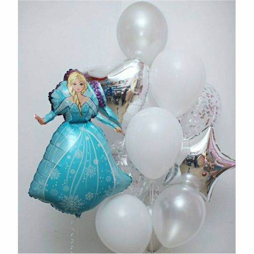 Состав: шарф фольгированный Эльза с гелием 100см - 1шт, звезда фольгированная с гелием 45см - 2 шт , шарф с конфети с гелием 30см - 2шт, шары однготонные с гелием 30 см - 7шт, грузик
