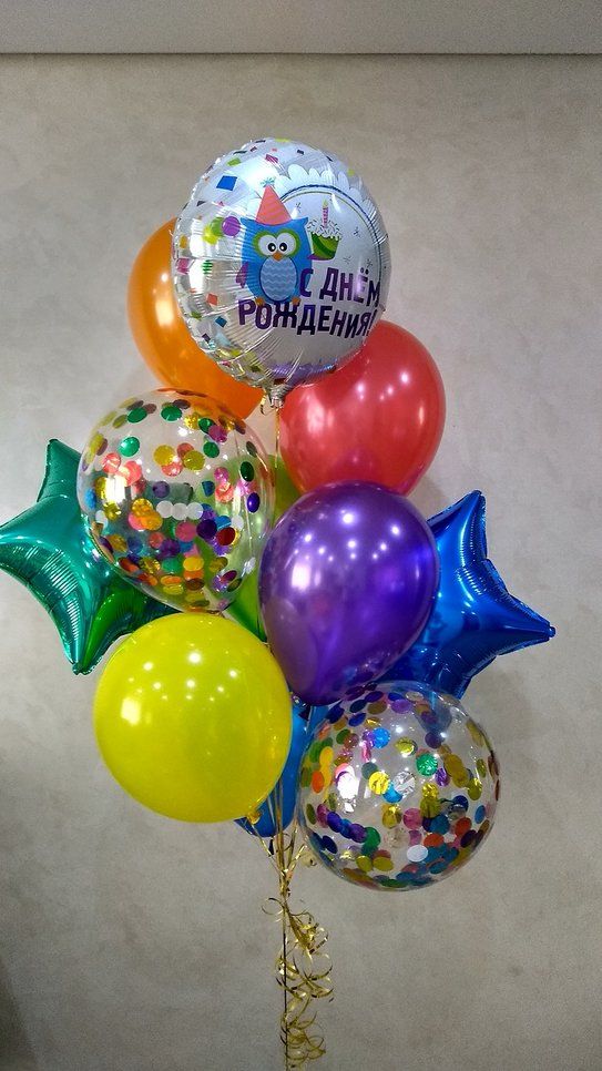 Состав набора шаров: звзеда фольгированная с гелием 45 см - 2 шт, фольгированный круг "С днем рождения!" с гелием 46см - 1 шт, шары с конфетти с гелием 30см - 2 шт, шары однотонные с гелием 30см - 6 шт, грузик.