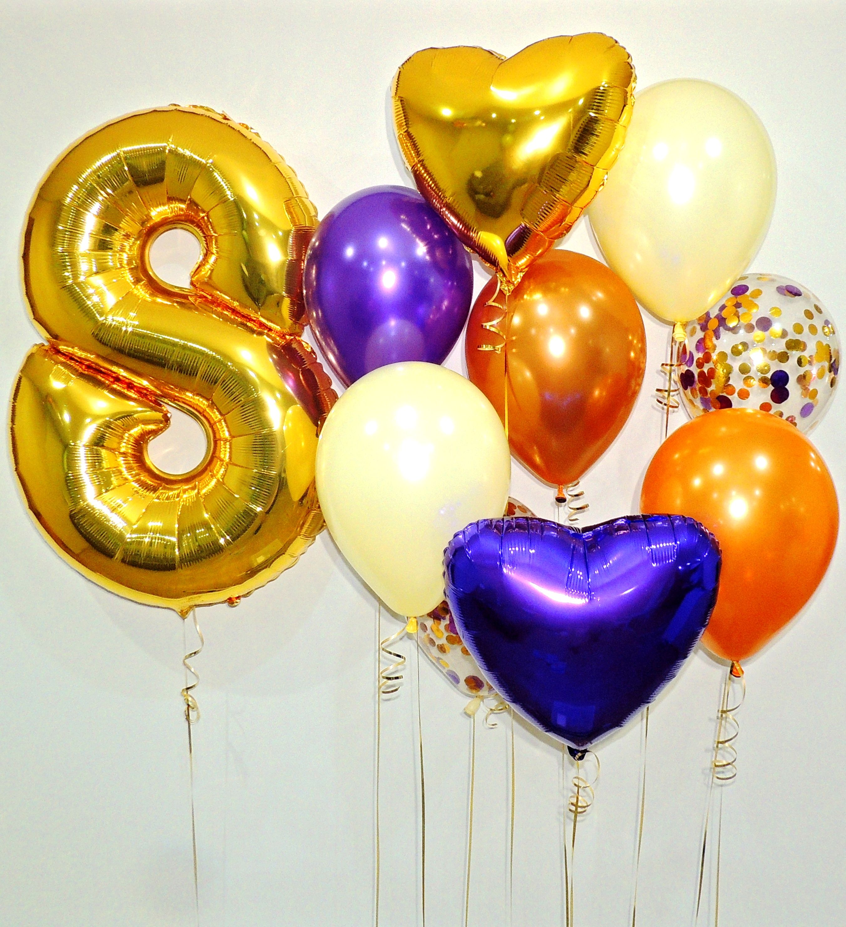 Состав набора шаров с гелием: цифра фольгированная с гелием (любая одна) - 1 шт, сердце фольгированное с гелием 45см - 2 шт, шары с конфетти 2 шт., шары однотонные с гелием 5 шт, грузики, транспортировочный пакет.
