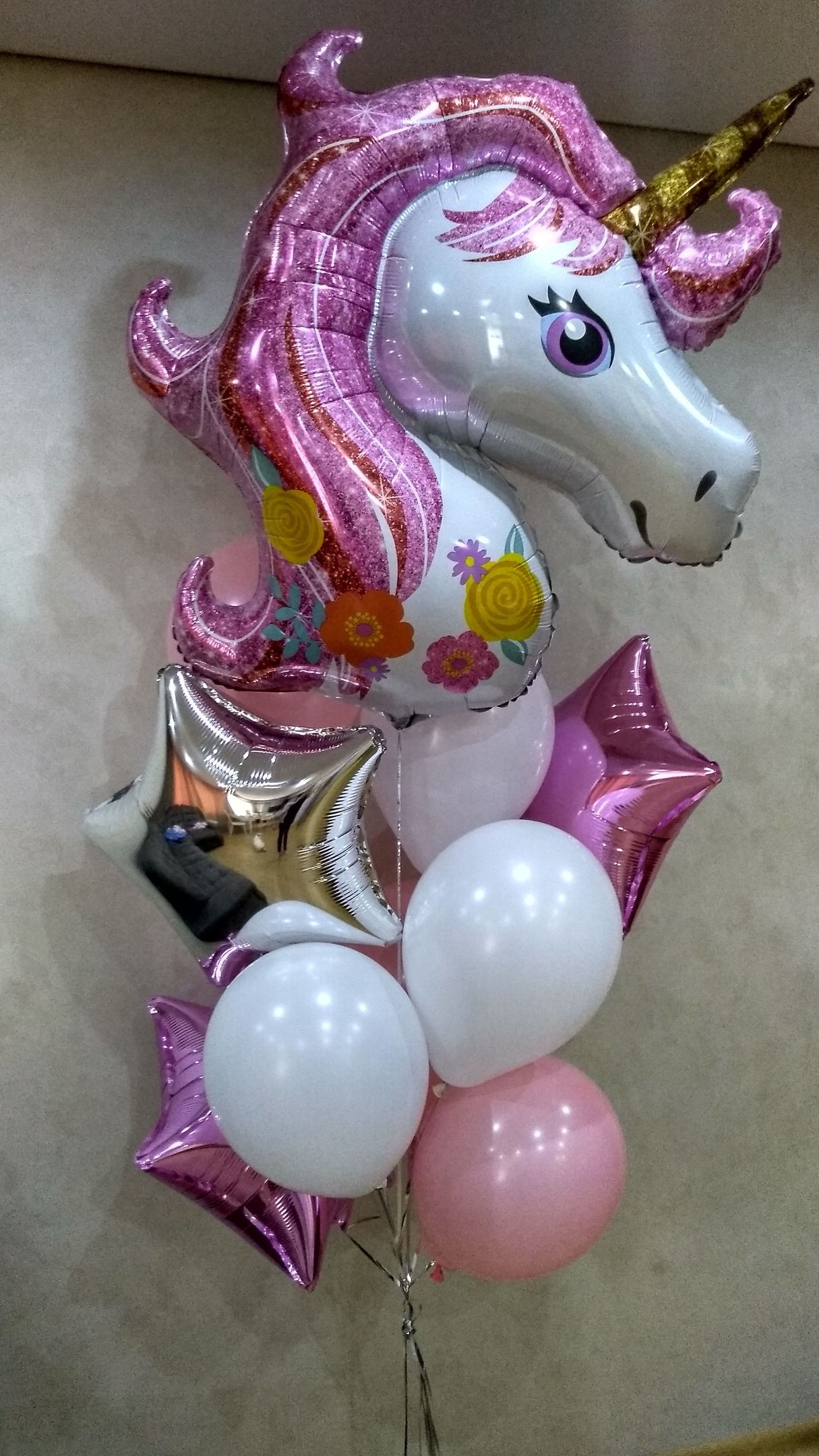 Состав набора шаров с гелием : голова единорога с гелием - 1 шт, шары однотонные с гелием 30 см - 7 шт, звзеды фолльгированные с гелием 45см - 3 шт, грузик, транспортировочный пакет.