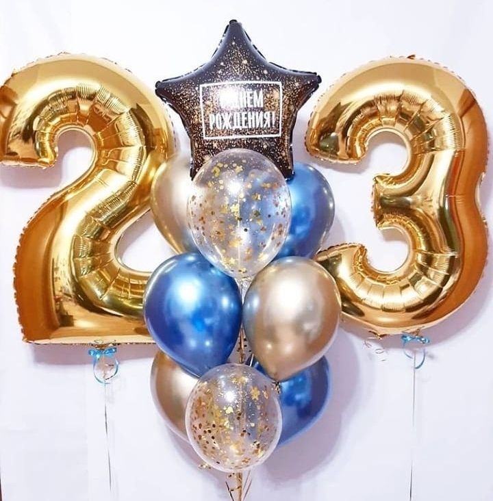 Состав набора шаров с гелием: цифры фольгированные с гелием (две, любые) - 2 шт, звзеда фольгированная с гелием " С днем рождения!" 45см - 1 шт, шары с конфетти с гелием 30см - 3 шт, шары хром (золото. синий) с гелием 30см - 6 шт, грузики, транспортировочные пакеты.