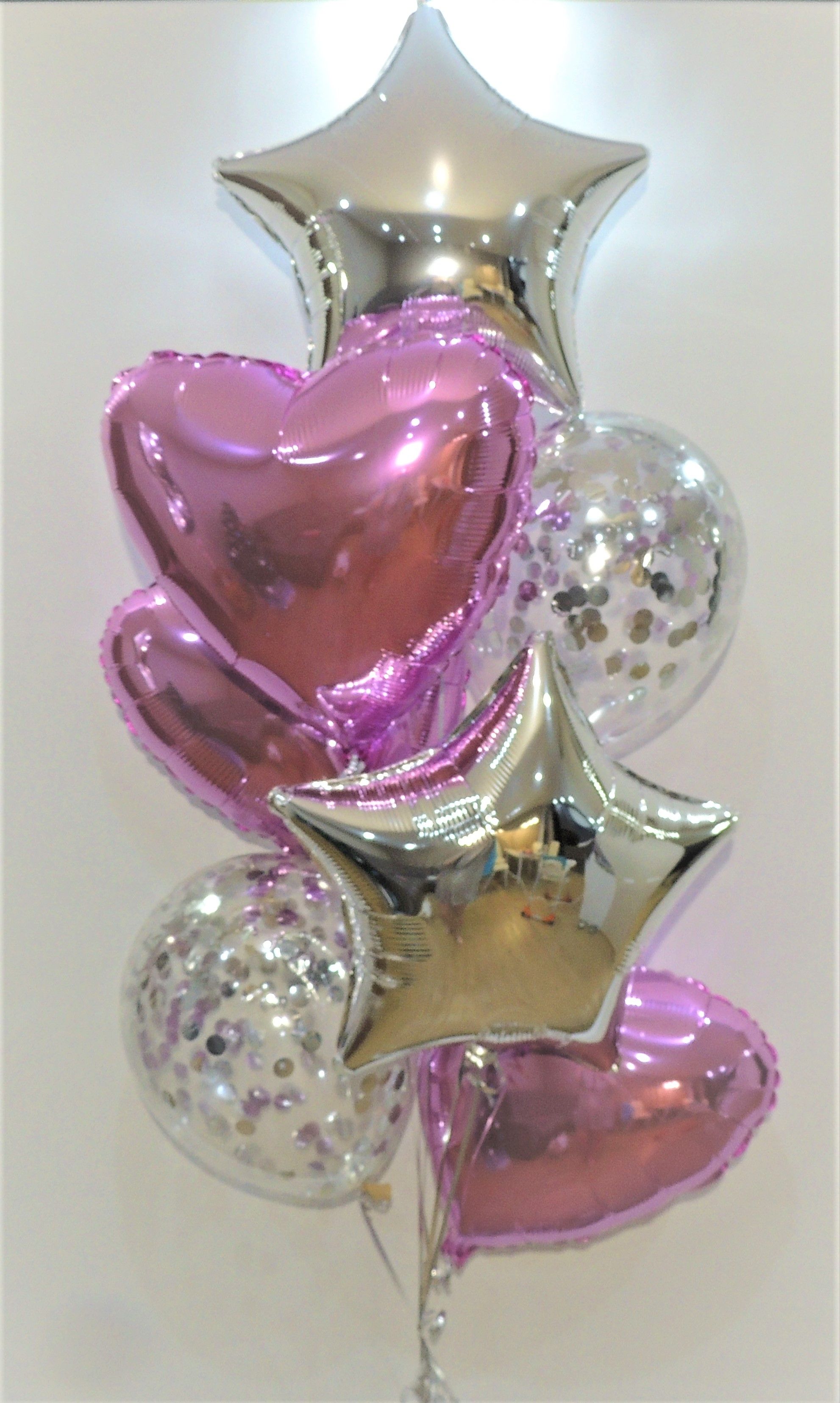 Состав набора шаров: сердце фольгированное с гелием 45см - 3 шт, звезда фольгированная с гелием 45см - 2 шт, шары с конфетти с гелием 30см - 2 шт, грузик, транспортировочный пакет.