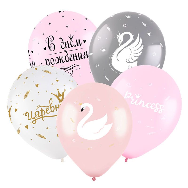 Воздушные шары с гелием "Царевна-лебедь С Днем Рождения!" 30см. Цветовая палитра:белый, нежно-розовый, серый, светло-розовый.