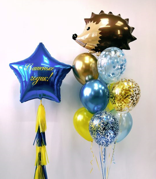 Состав набора шаров с гелием :фольгированная фигура с гелием "Ёжик", однотонные шары с гелием - 4 шт, латексные шары с гелием хром - 2 шт, шары с конфетти с гелием - 3 шт, фольгированная звезда с гелием 71 см с индивидуальной надписью (надпись может быть любая) с тассел гирляндой, грузики ручной работы, транспортировочный пакет.