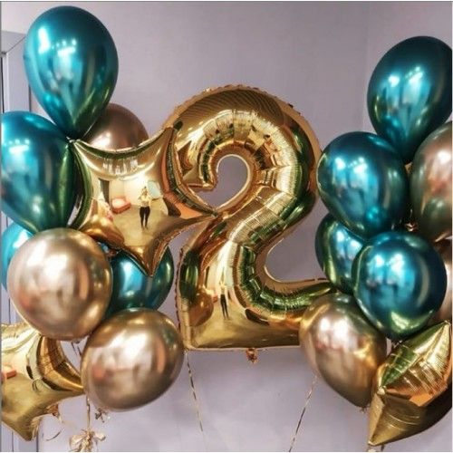 Состав набора шаров с гелием: цифра фольгированная с гелием (одна, любая) - 1 шт, звзеда фольгированная с гелием - 4 шт, шары хром с гелием - 14 шт, грузики ручной работы, транспортировочные пакеты.