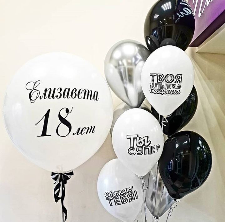 Состав набора шаров с гелием: шар гигант с и ндивидуальной надписью с гелием - 1 шт, шары с рисунком с гелием - 3 шт, шары однотонные с гелием 3 шт, шары хром с гелием - 3 шт, грузики, транспортировочный пакет
