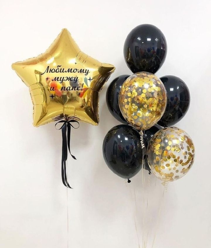 Состав набора шаров с гелием : звезда фольгированная с гелием с индивидуальной надписью 78 см - 1 шт, шары с конфетти с гелием - 2 шт, шары однотонные с гелием - 5 шт, грузики, транспортировочный пакет.