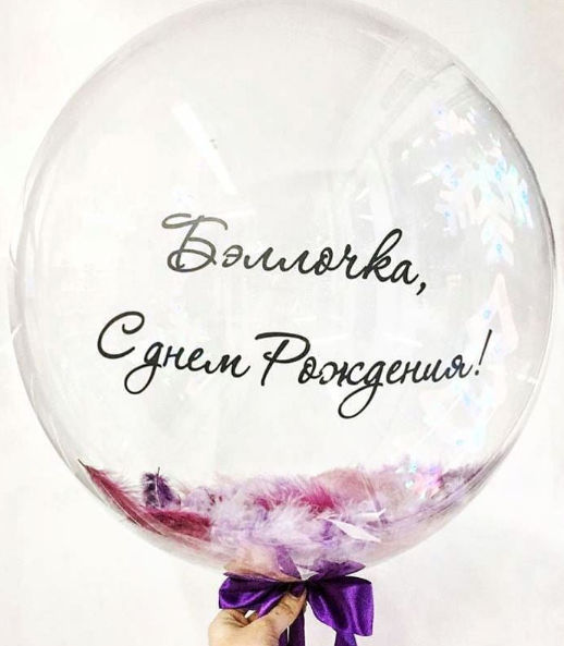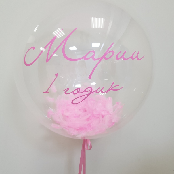 Воздушный шар Баблс с гелием с индивидуальной надписью и перьями размер шара 60 сантиметров.