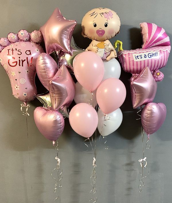 Состав: 1 фольгированная фигура пяточка для девочки (розовая) – 96 см,1 фольгированная фигура Малыш девочка – 68 см, 1 фольгированная фигура Коляска для девочки (розовая) – 102 см, 3 фольгированные звезды (розовые) – 46 см, 2 фольгированные звезды (серебро) – 46 см, 3 фольгированных сердца (розовые) – 46 см, 3 шара пастель (розовые) – 30 см, 3 шара пастель (белые) – 30 см